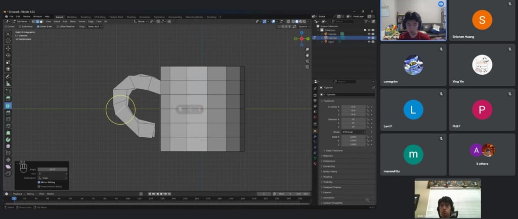 The seventh and final online 3D modeling class was hosted on 3/9/2025, and was taught by Jerry Yang and assisted by Eric Huang from 11:00am to 12:30pm. Students had a quick recap about edit mode before having a warmup of creating a 3D model of a sand timer to practice their loop cutting skills. After the warmup, they went straight into the animal project, where they have work time creating a 3D model of a horse with assistance and guidance from Jerry and Eric. Finally, the students were taught how to render the horse out briefly, and Jerry provided his example of the 3D horse to the class. Additionally, Jerry spent two hours making a PowerPoint presentation with 23 slides showing the warmup, recapping edit mode, guiding the students that were behind, and finally, introducing the students to render mode and showing how