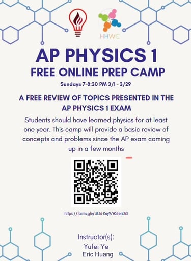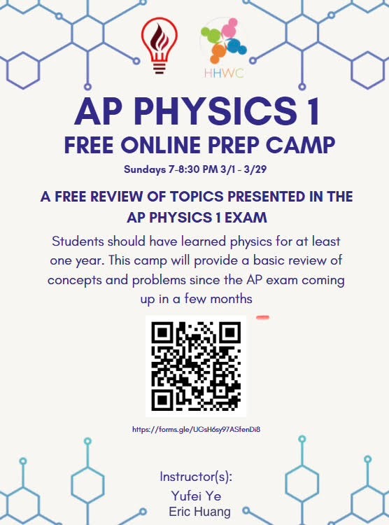 HHWG is excited to offer a FREE 5‑session AP Physics 1 Online Prep Camp running from March 1 to March 29, 2026. Students preparing for the AP Physics 1 exam are encouraged to register and join us for this focused review series.