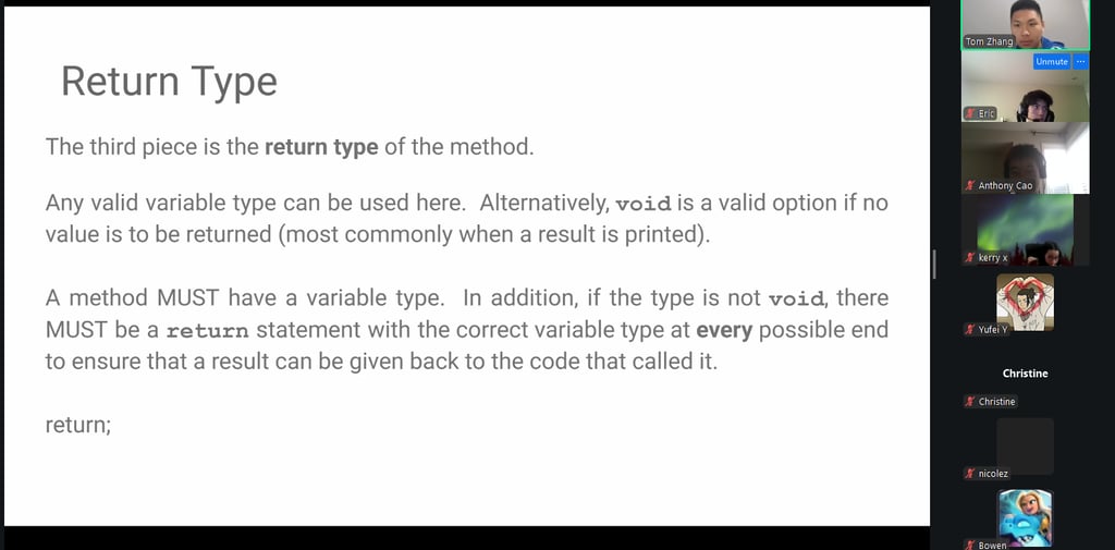 HHWG successfully hosted the Winter Advanced Java Camp, a five‑session program held from December 26 to December 30. The camp was led by instructors Zhebin Zhang, Eric Huang, Anthony Cao, and Kerui Xu. Sessions ran daily from 1:30–3:30 PM. In addition to teaching, Zhebin Zhang dedicated extra time after each session to answer students’ questions and review homework.