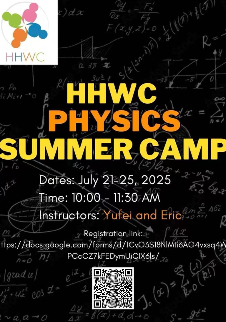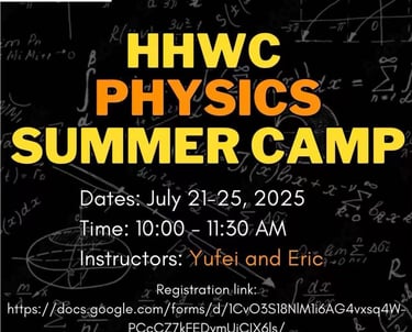 HHWC hosted a 5-day Physics Camp for middle school students from July 21 to July 25. The camp offered an enriching educational experience, helping students build a solid foundation in physics while gradually exploring more advanced concepts. Our team members, Yufei Ye and Eric Huang, served as instructors during the camp. Each day, the regular lecture began at 10:00 a.m. and lasted for two hours. In addition to teaching, Yufei provided homework support, answered student questions, and dedicated time to reviewing and correcting assignments. Over the course of five sessions, participants engaged with core topics that are essential for understanding the physical world.