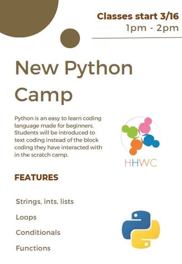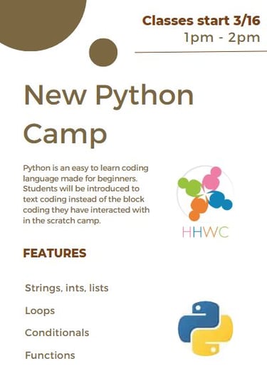 The HHWC Python Project Team proudly hosted the 2025 Beginner Python Camp—a seven-week journey into coding fundamentals that ran from March 09 to May 11, 2025. Led by Joey Zhu, with dedicated support from TAs Xiao, Ryan, and Jerry, the camp welcomed 14 enthusiastic students ready to embark on their Python programming adventure. Weekly Schedule: Sundays, 1:00–2:00 PM.