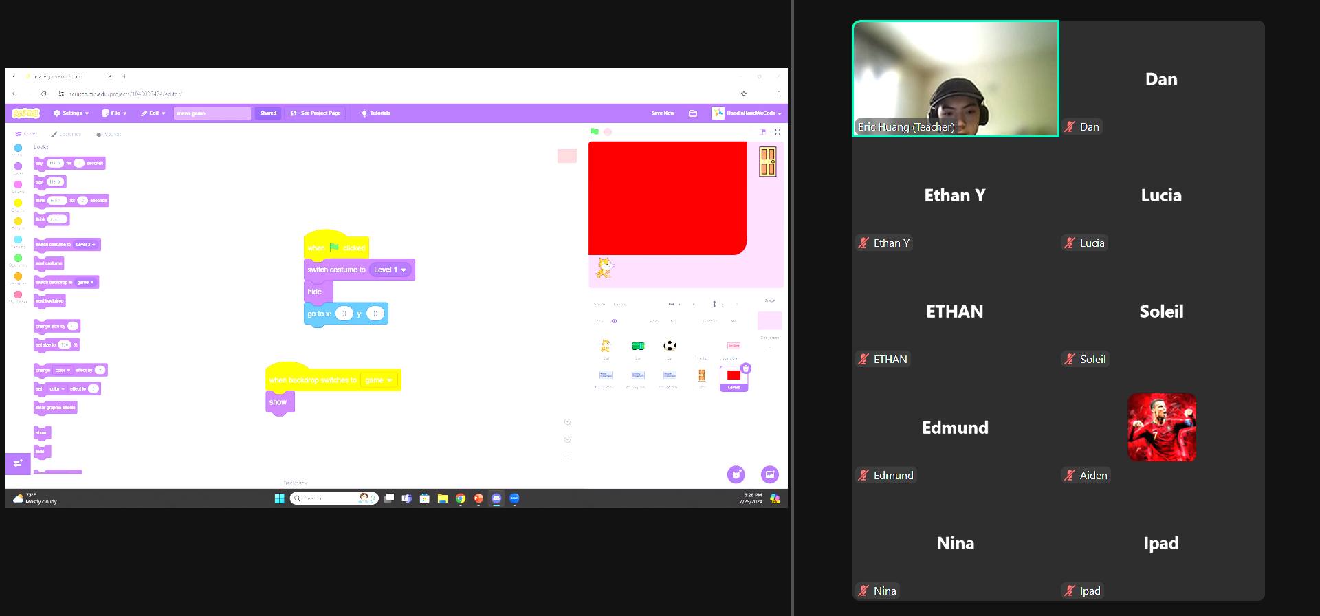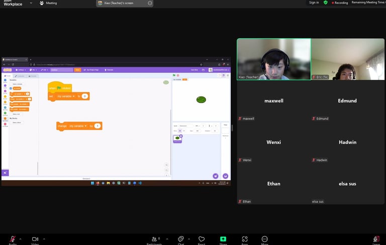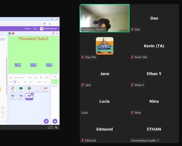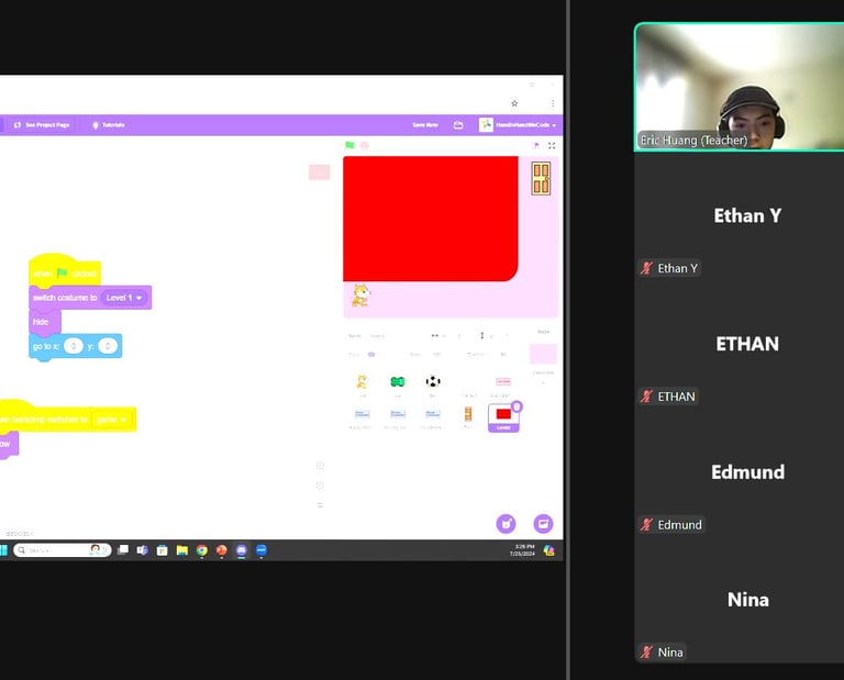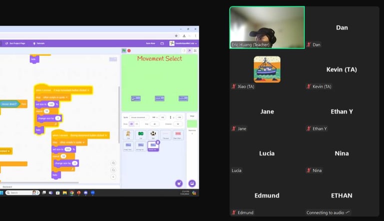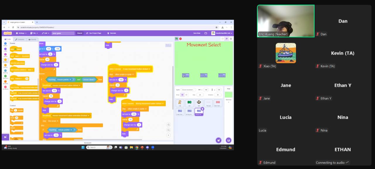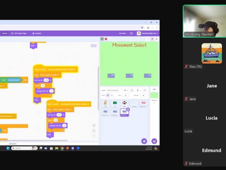 Our Scratch Project Team hosted an online Intermediate Scratch Camp(10 sessions). This program is designed for students who have completed our 2024 Summer Camp or have equivalent basic knowledge of Scratch. Each week, teachers guide students to work on and complete a specific game project. The sessions are independent, allowing students to choose topics that interest them.